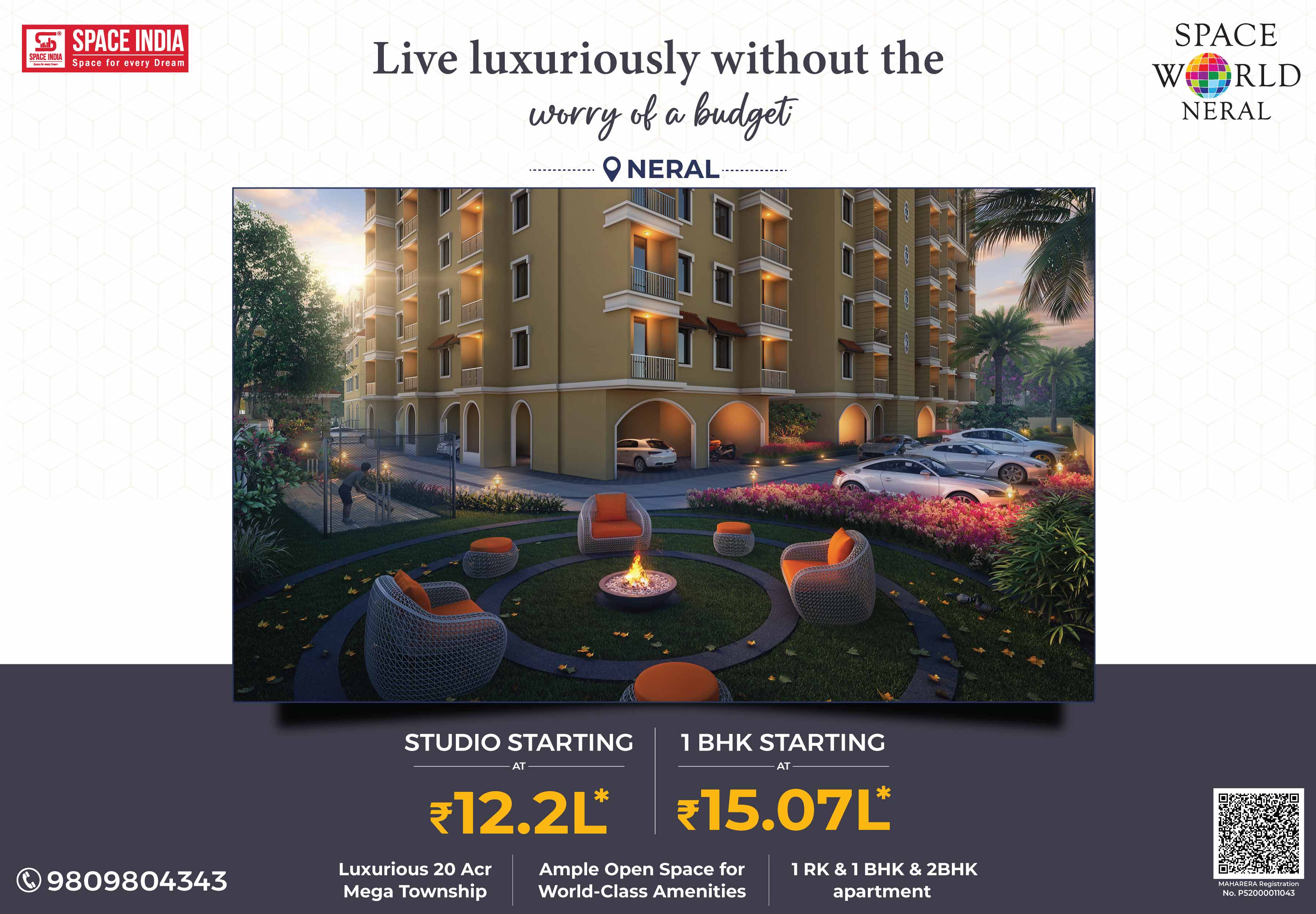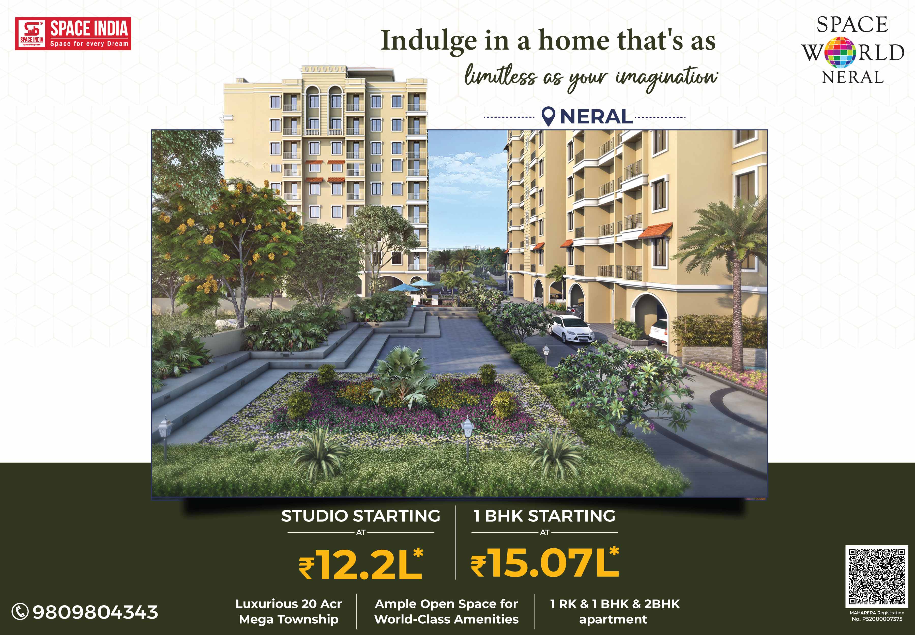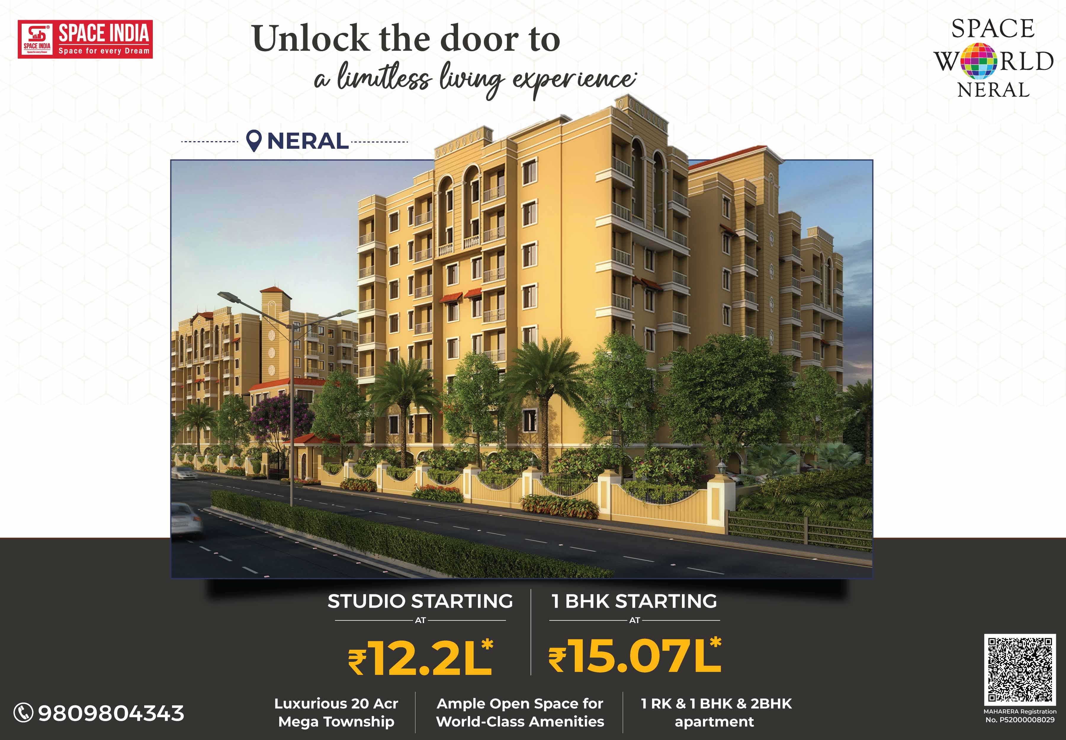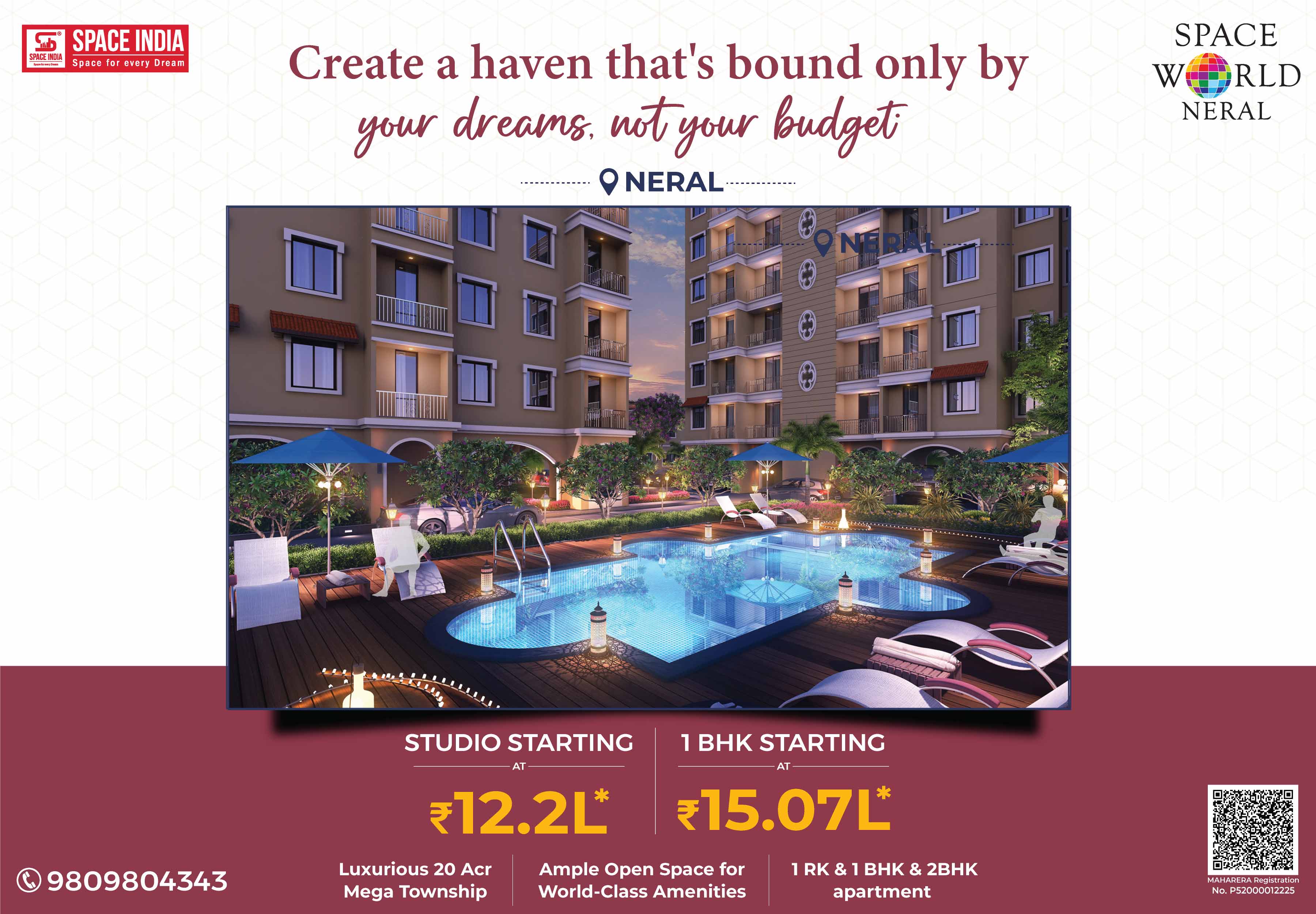 Welcome to a New World where you can live life in a stress-free atmosphere close to nature. Come home to SPACE WORLD a 20-acre Township designed by Arch. Hafeez contractor near Matheran Hill station in Neral. More than its World-Class amenities, Space World is about cherishing a noise-free, pollution-free, traffic-free. Giving you the Perfect Urban Lifestyle with Peaceful Serene Natural Living Experience. A host of Luxurious Recreational Amenities like Swimming Pool, Jogging Track, High-tech Air-conditioned Gymnasium, Landscaped Gardens for families, Children’s Play Area, Dedicated Senior Citizens Sit-out Area, and Spacious Multipurpose Banquet Hall to celebrate your Family Functions & Programs. Surrounded by Schools, Colleges, Hospitals, Banks, ATMs, Malls, Multiplexes, Supermarkets, Grocery Shops, Fruits & Vegetable Markets with good train connectivity
