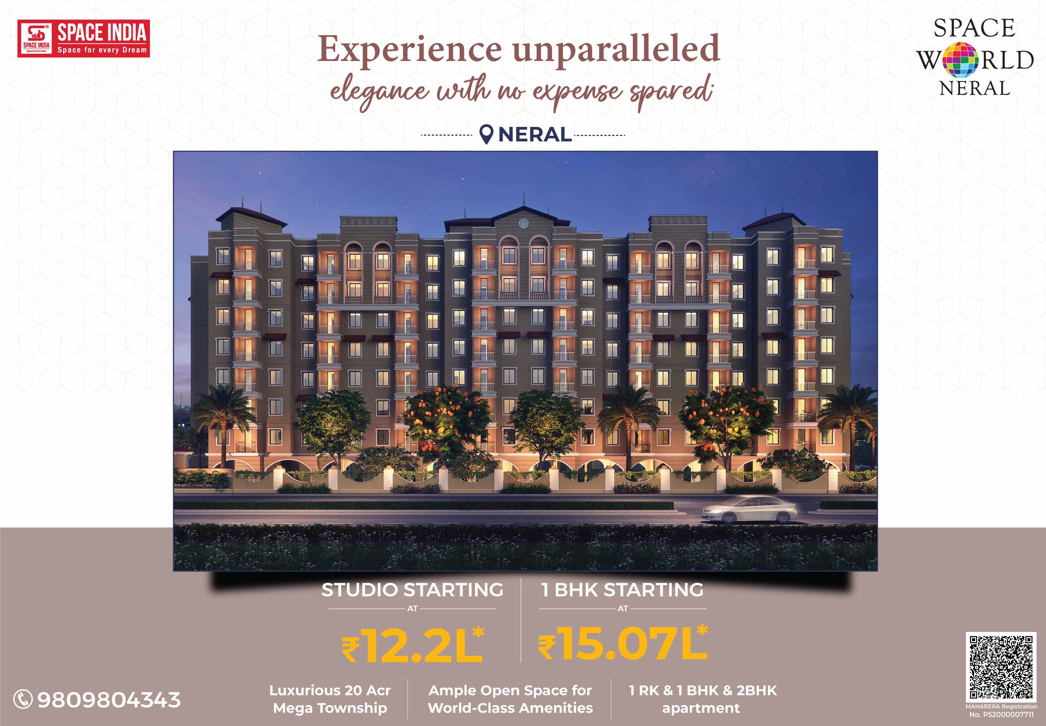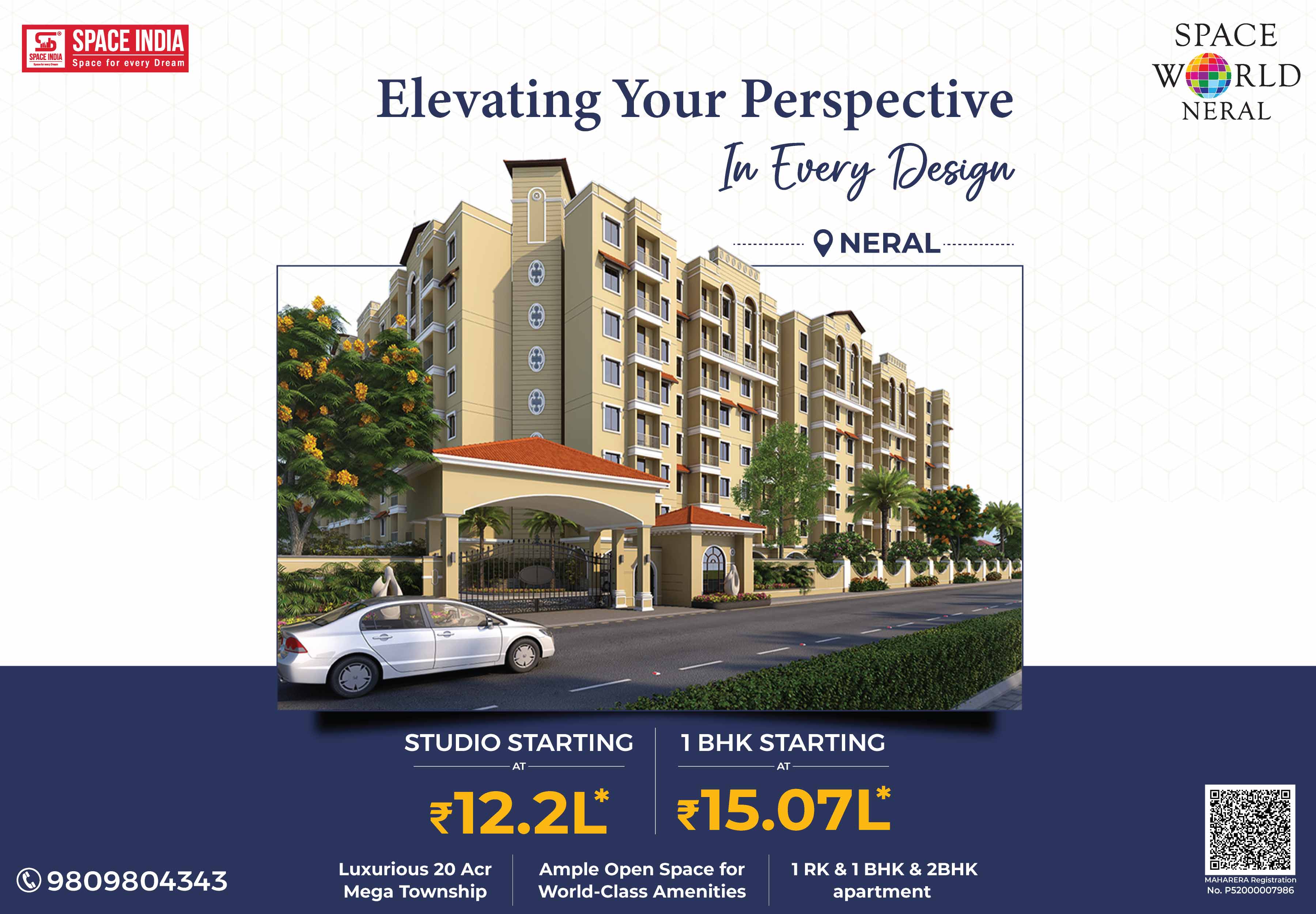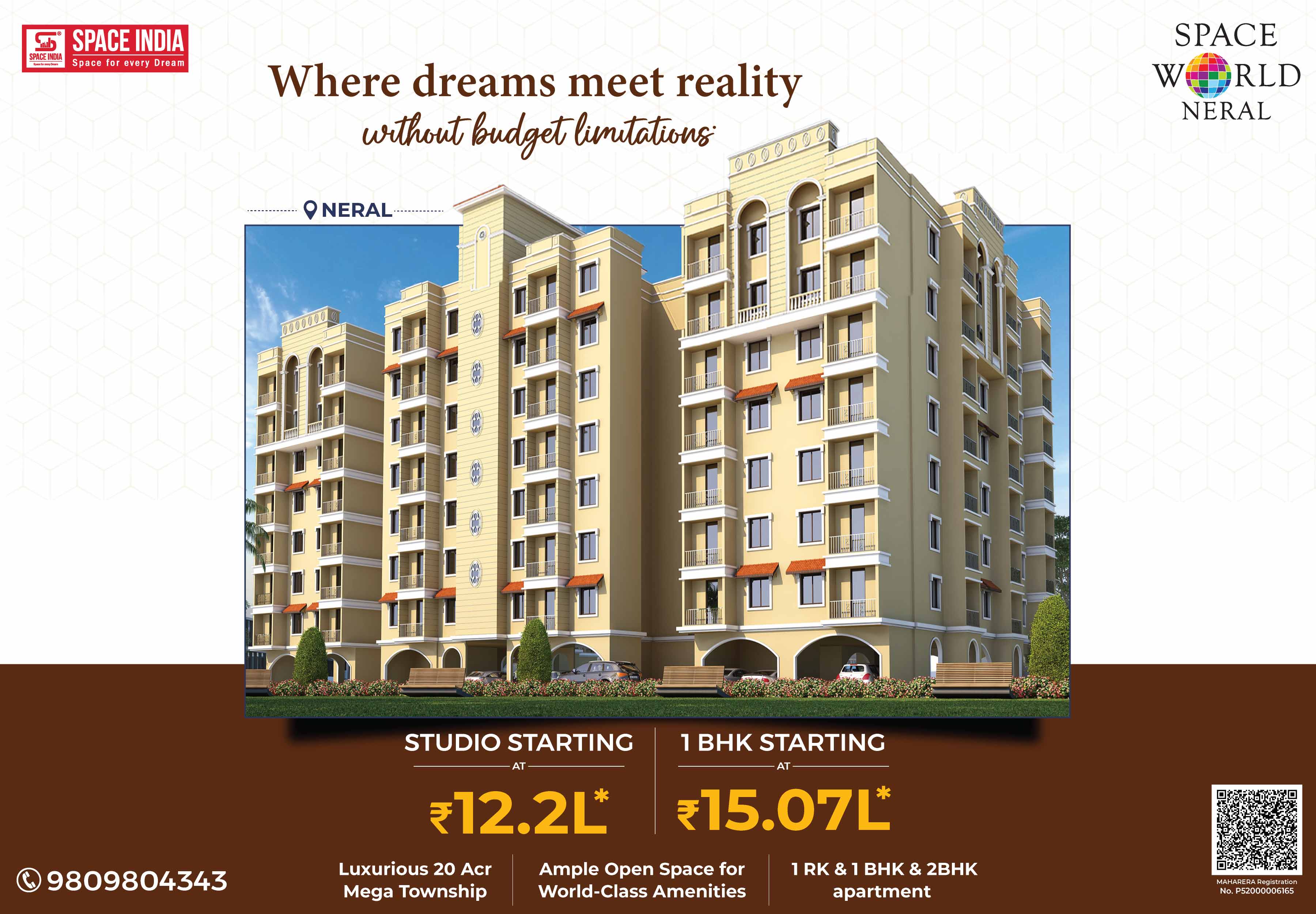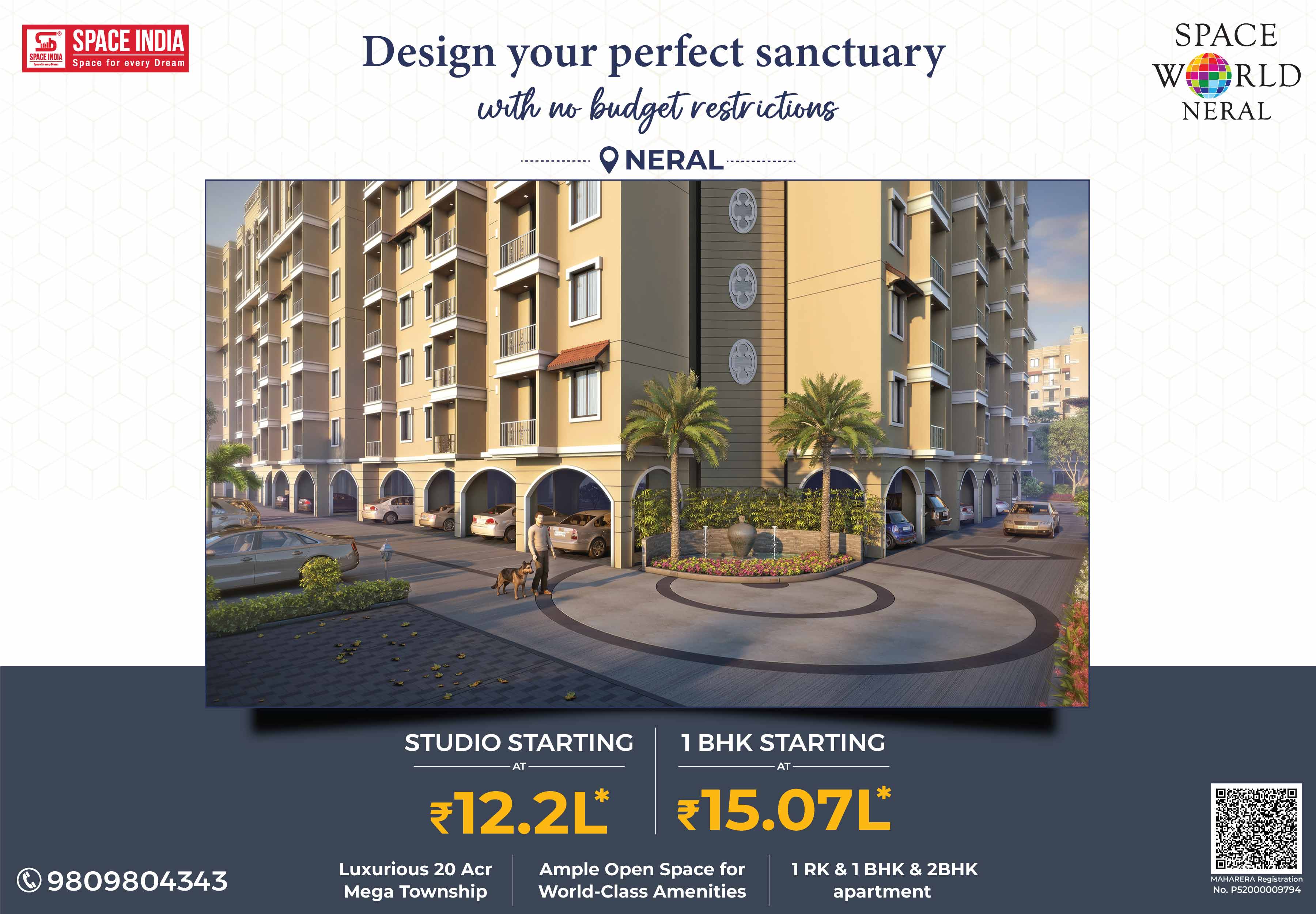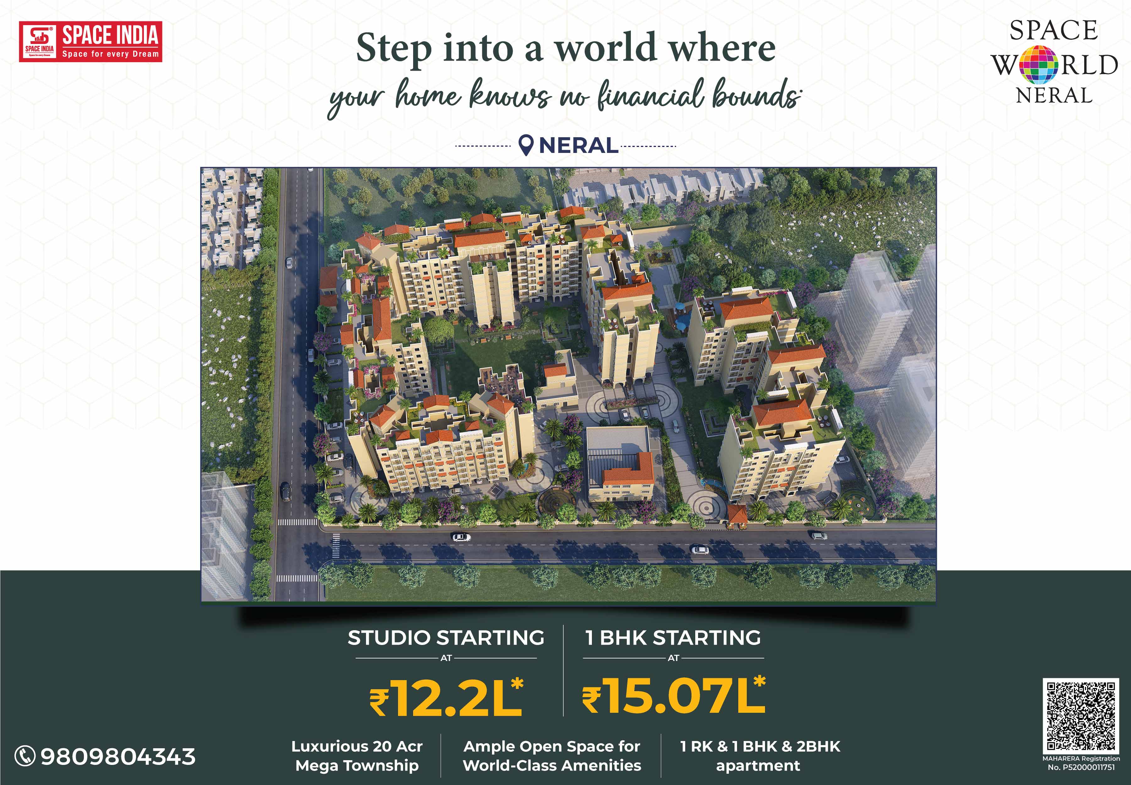 Welcome to a New World where you can live life in a stress-free atmosphere close to nature. Come home to SPACE WORLD a 20-acre Township designed by Arch. Hafeez contractor near Matheran Hill station in Neral. More than its World-Class amenities, Space World is about cherishing a noise-free, pollution-free, traffic-free. Giving you the Perfect Urban Lifestyle with Peaceful Serene Natural Living Experience. A host of Luxurious Recreational Amenities like Swimming Pool, Jogging Track, High-tech Air-conditioned Gymnasium, Landscaped Gardens for families, Children’s Play Area, Dedicated Senior Citizens Sit-out Area, and Spacious Multipurpose Banquet Hall to celebrate your Family Functions & Programs. Surrounded by Schools, Colleges, Hospitals, Banks, ATMs, Malls, Multiplexes, Supermarkets, Grocery Shops, Fruits & Vegetable Markets with good train connectivity